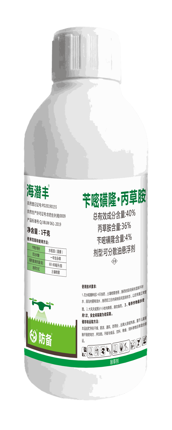 - 海潜丰为苄嘧磺隆、丙草胺的复配制剂,含安全剂解草啶,对水稻安全,受害杂草幼苗扭曲初生叶难伸出,叶色变深绿,生长停止,直至死亡。可用于防除水稻直播田一年生杂草。